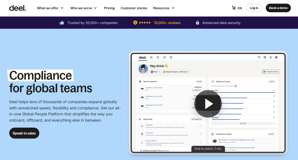 Profile: Functional for mainstream markets, but compliance depth and support consistency at scale warrant scrutiny. Best suited to businesses hiring in well-established jurisdictions where regulatory complexity is lower.
